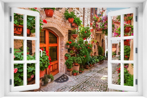 Fototapeta 3D Okno Krajobraz Uliczka Kwiaty kr-337