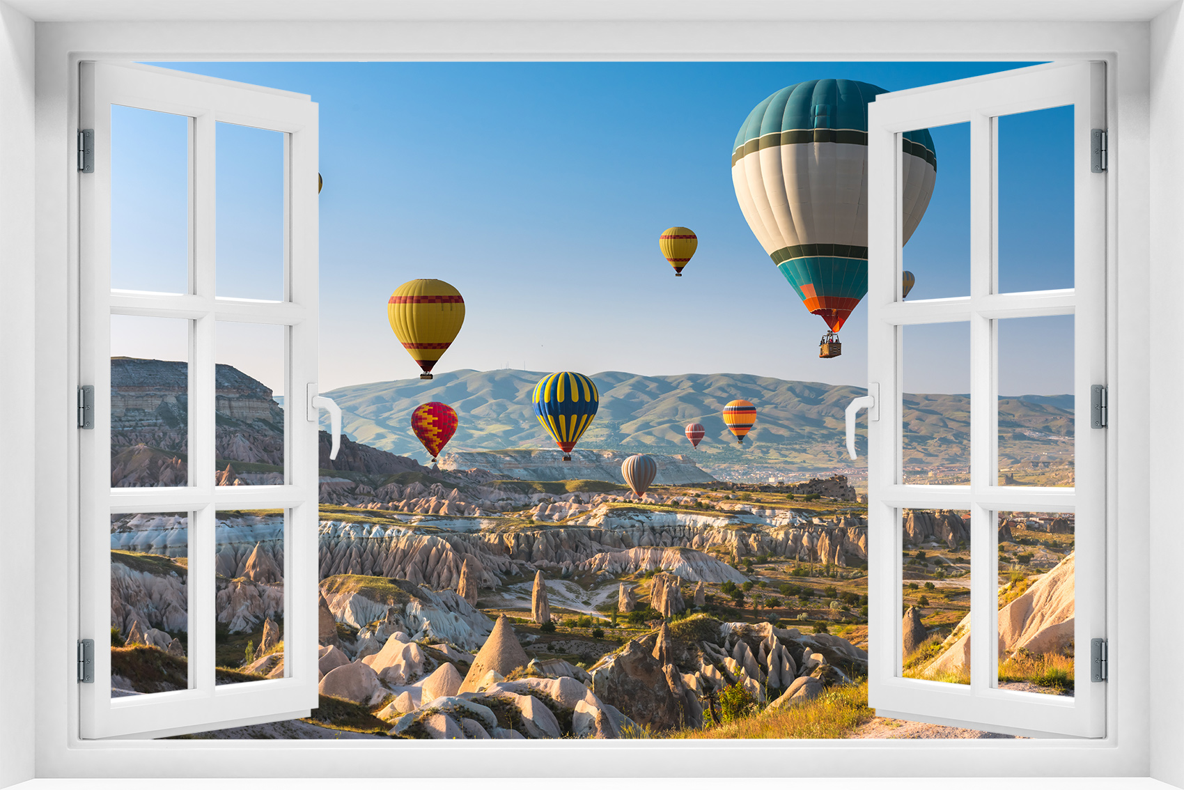 Fototapeta 3D Okno Krajobraz Balony - kr-458