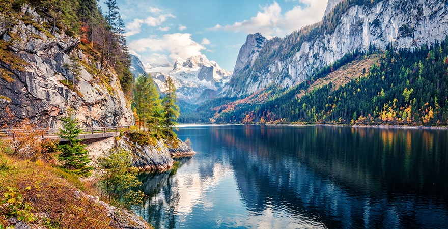 Kolorowa jesień panorama jeziora Vorderer (Gosausee) z lodowcem Dachstein w tle - #5397