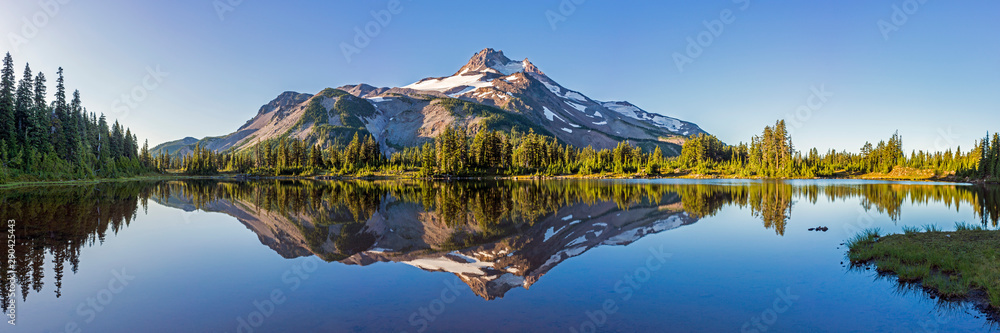Wulkaniczna góra w porannym świetle, odbicie w spokojnych wodach jeziora, panorama - #5387