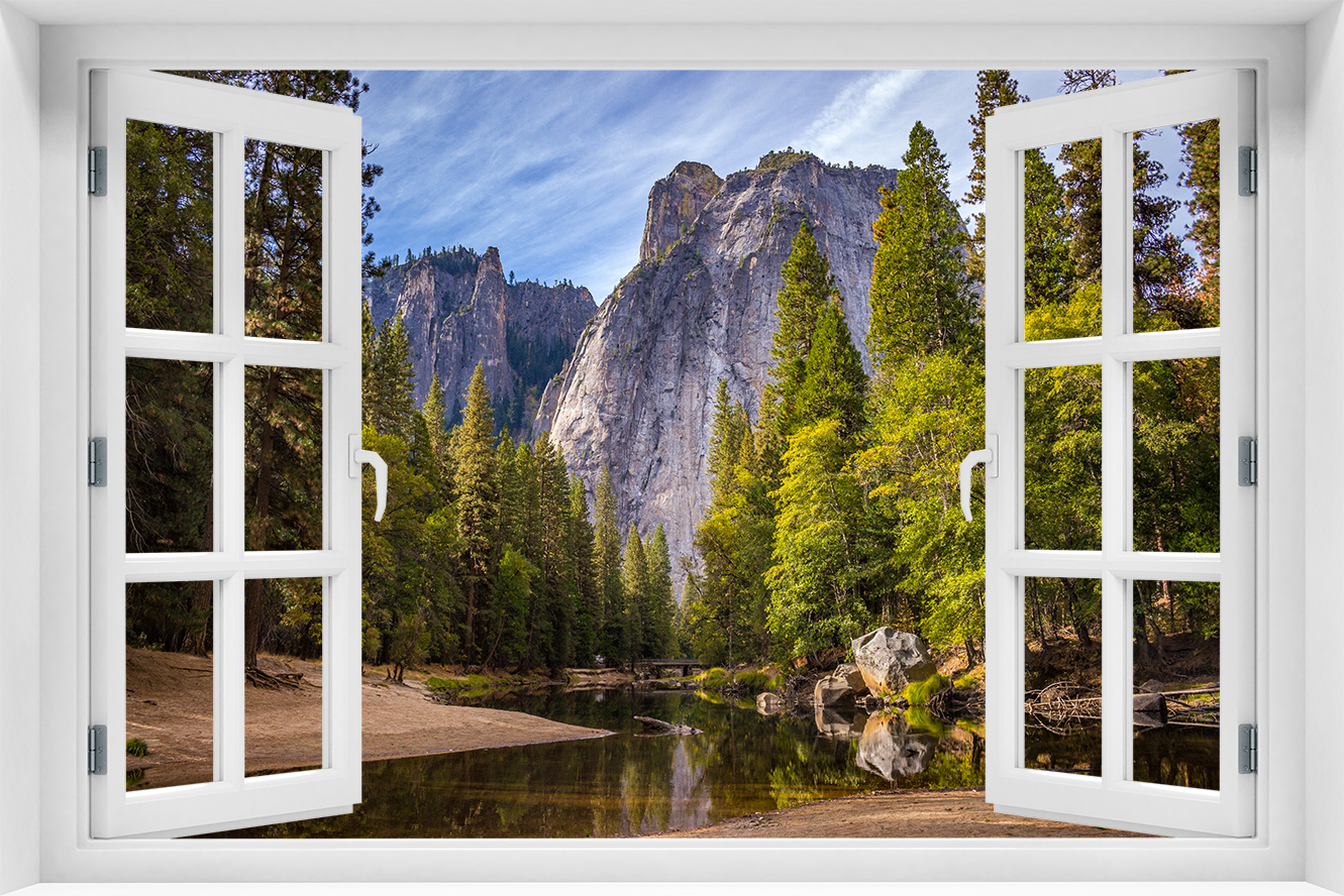 Fototapeta 3D Okno Góry Rzeka Drzewa Las kr-68
