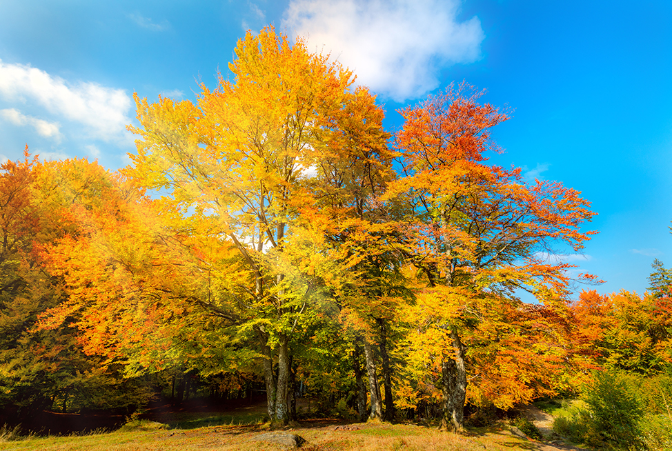 Słoneczny jesienny krajobraz, duże kolorowe drzewa w lesie - #5372