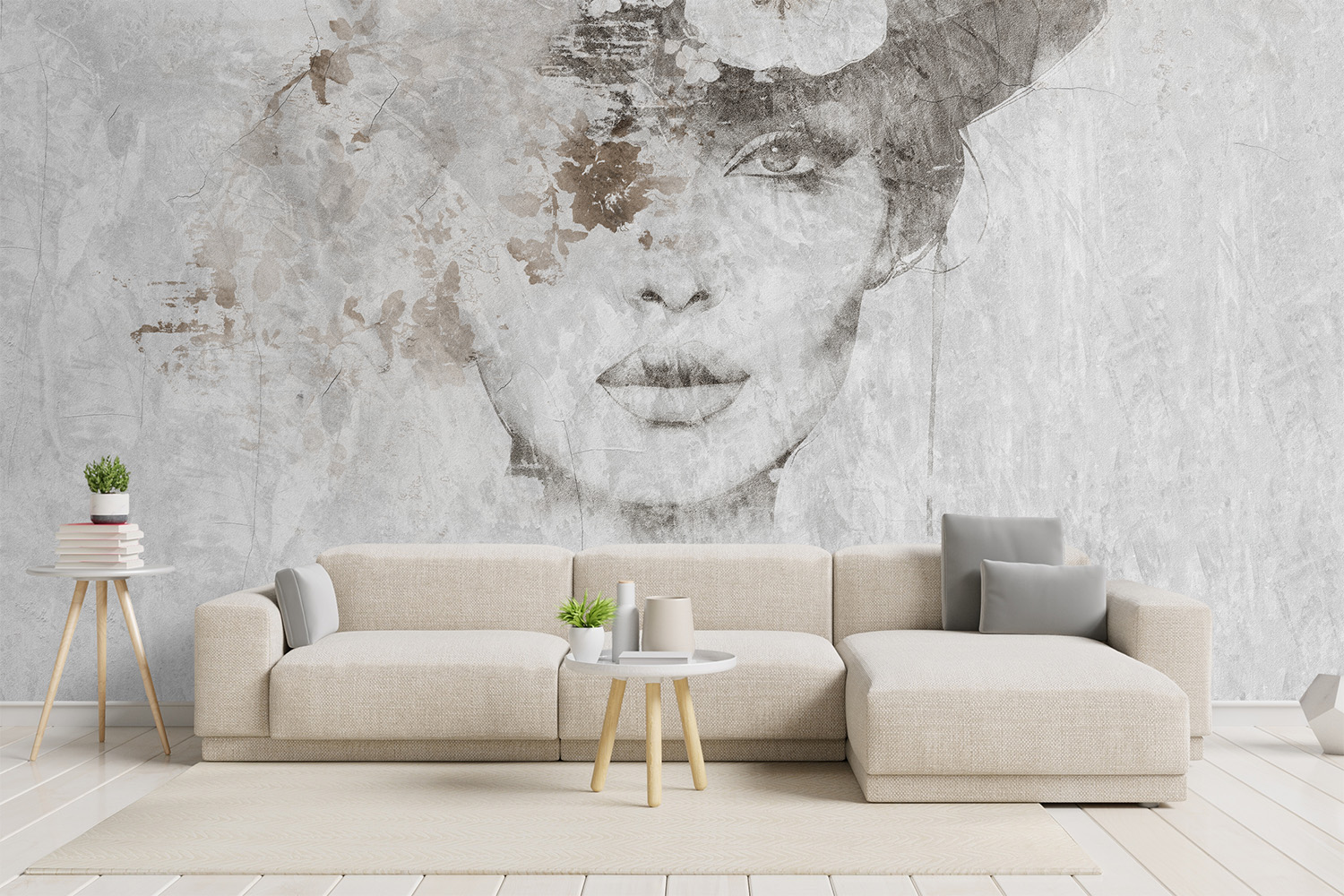 Tapeta kobieca twarz kwiaty beton #7816