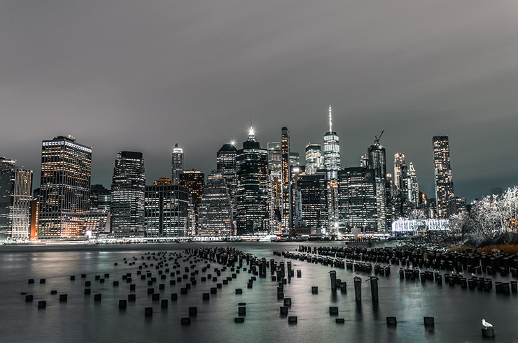 Stare filary Brooklyn Pylon z widokiem na dolną dzielnicę finansową Manhattanu - #5373
