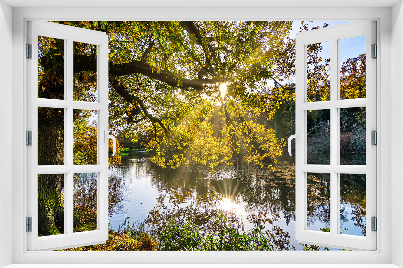 Fototapeta 3D Okno Krajobraz Woda Drzewa Jesień kr-75