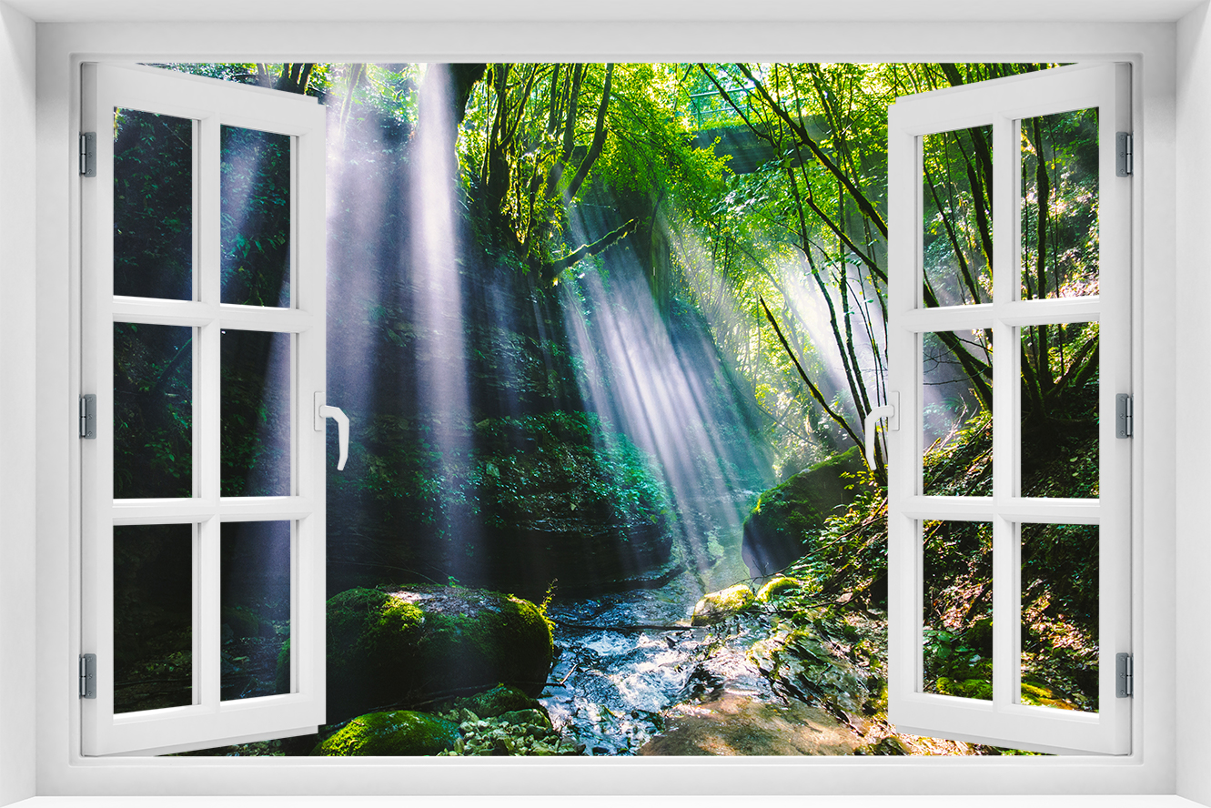 Fototapeta 3D Okno Strumyk Kładka Pejzaż Las kr-67