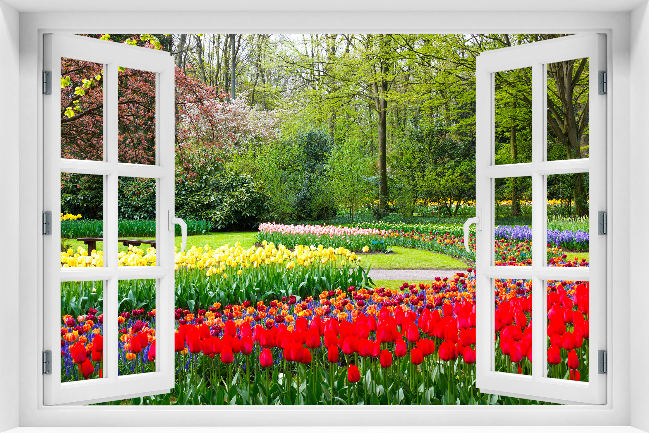 Fototapeta 3D Okno Park Kwiaty - kr-106
