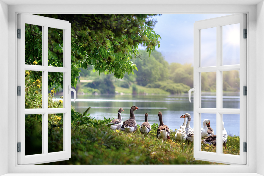 Fototapeta 3D Okno Krajobraz Rzeka Drzewa Gęsi - kr-242