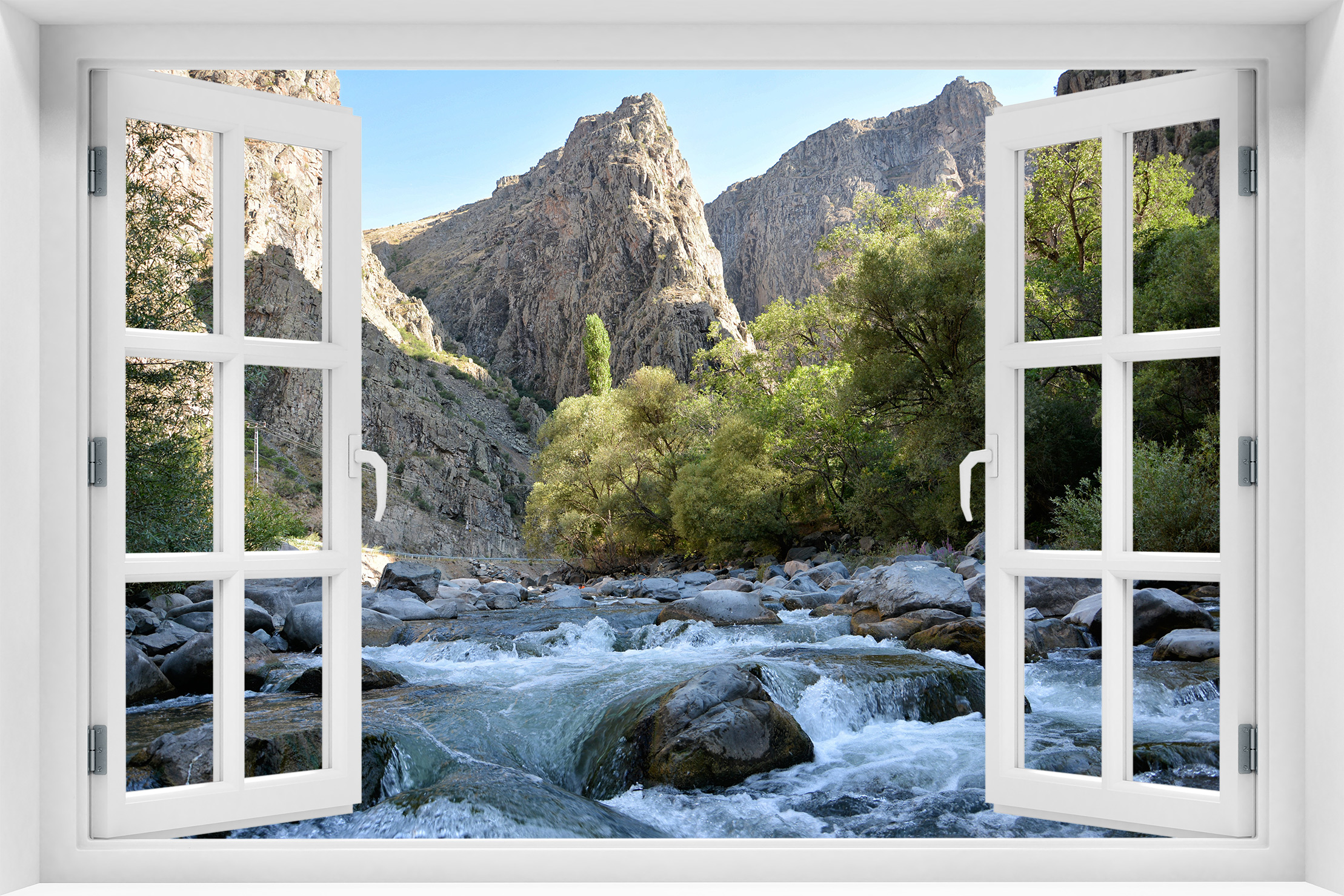 Fototapeta 3D Okno Góry Rzeka Pejzaż kr-63