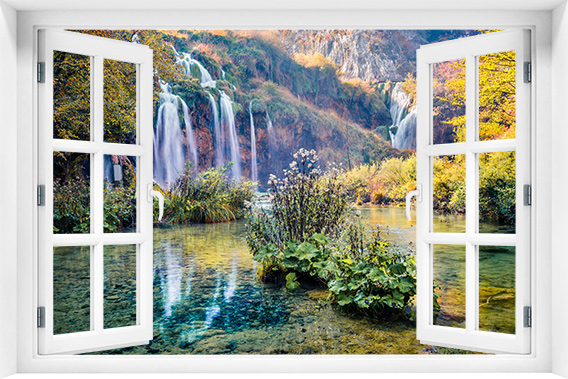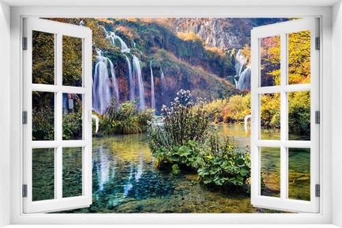 Fototapeta 3D Okno Krajobraz Jezioro Wodospad kr-298