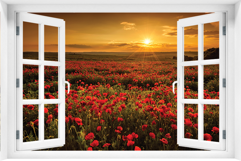 Fototapeta 3D Okno Krajobraz Kwiaty Zachód Słońca - kr-381