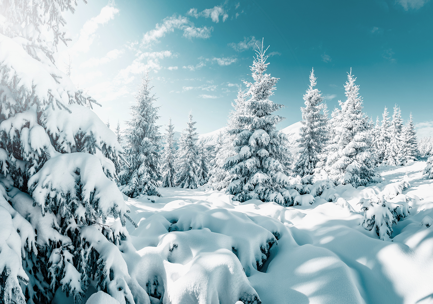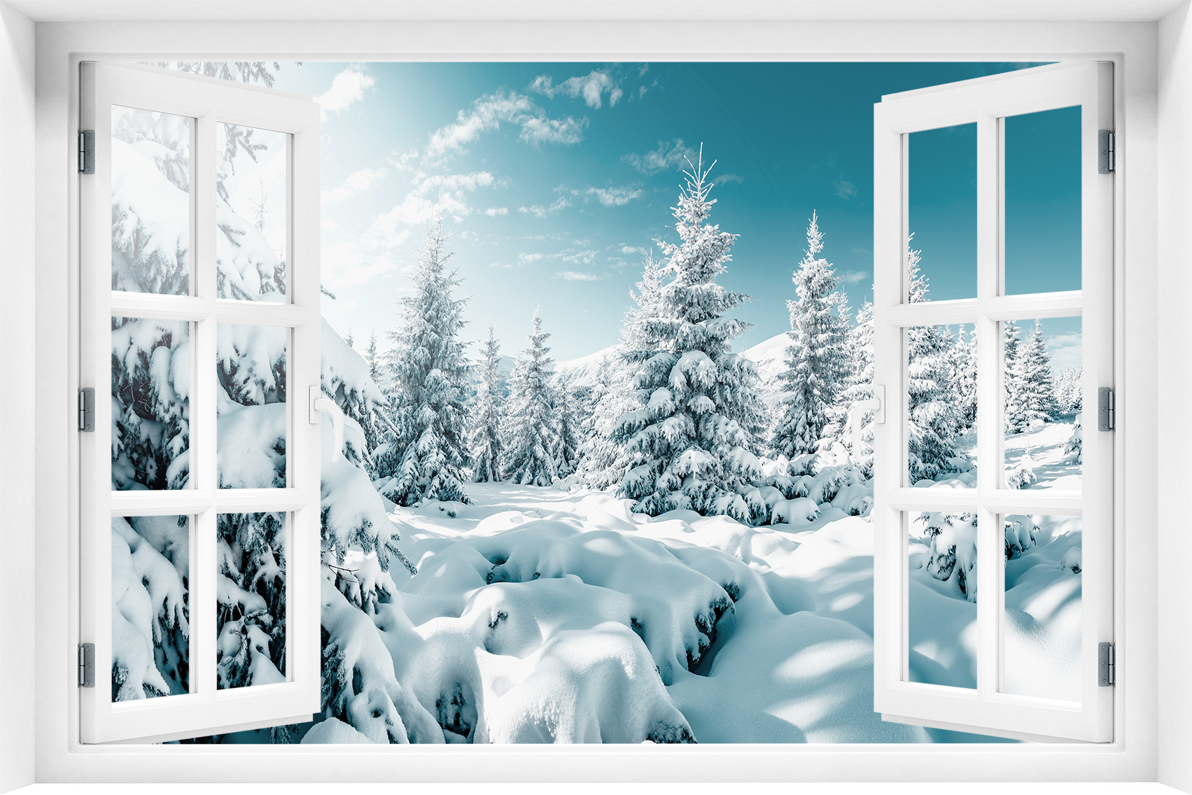 Fototapeta 3D Okno Choinki pokryte śniegiem - krz-23