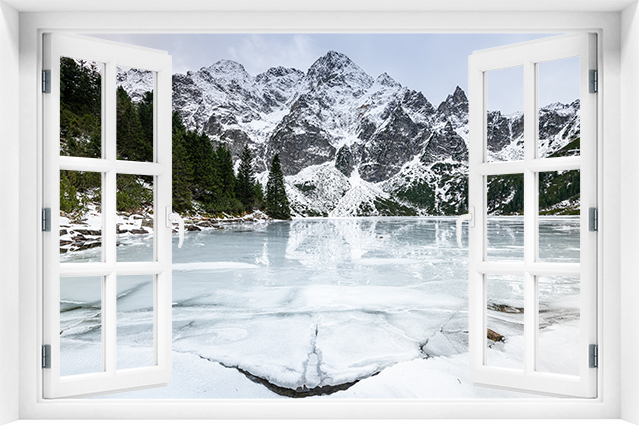 Fototapeta 3D Okno Piękny górski widok, zamarznięte jezioro - krz-25
