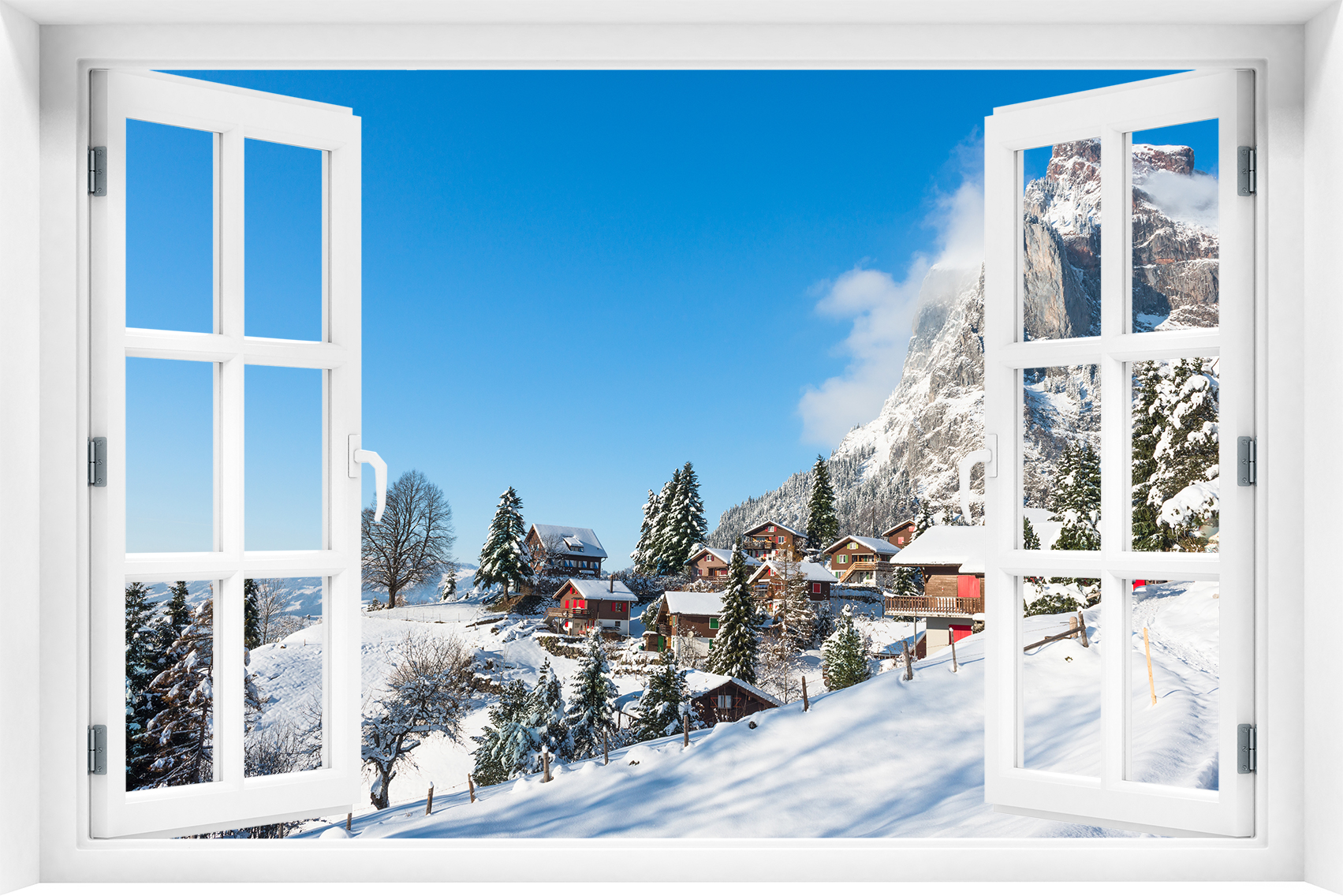 Fototapeta 3D Okno Widok na górską wioskę zimą - krz-22